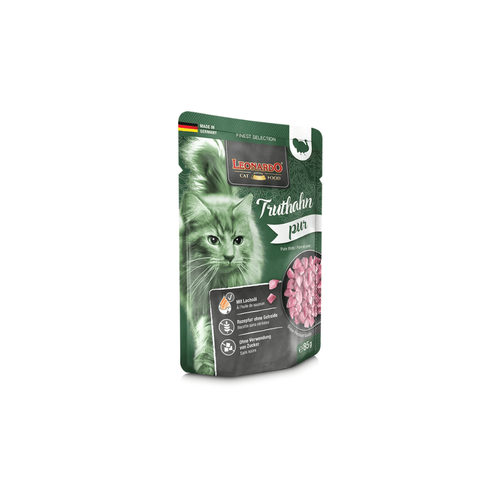 Sencillo y delicioso. LEONARDO Puro Pavo está hecho con pavo magro, fácil de digerir y lleno de nutrientes. Gracias al aceite de salmón, ayuda al bienestar de tu gato y hace que su pelaje brille.