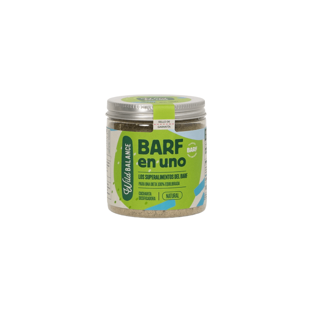 BARF EN UNO es un suplemento natural pensado para mantener a tu perro sano y lleno de energía. Está hecho con una mezcla de 10 superalimentos que no pueden faltar en su dieta: ascophyllum nodosum, arándano rojo, espirulina, harina de coco, mejillón de labio verde, alfalfa, romero, cáscara de escaramujo, semillas de chía y semillas de cáñamo. Todos estos ingredientes aportan vitaminas y minerales que ayudan a cubrir sus necesidades diarias y a cuidar su bienestar general.